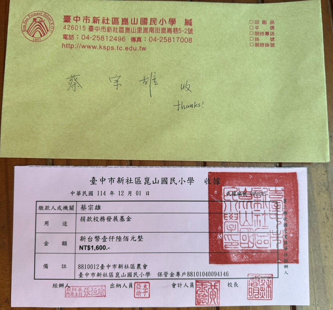 朋友客戶共襄盛舉協助捐助偏鄉教育,蔡秀聰捐獻4100元,陳逸璋捐獻250元+500元