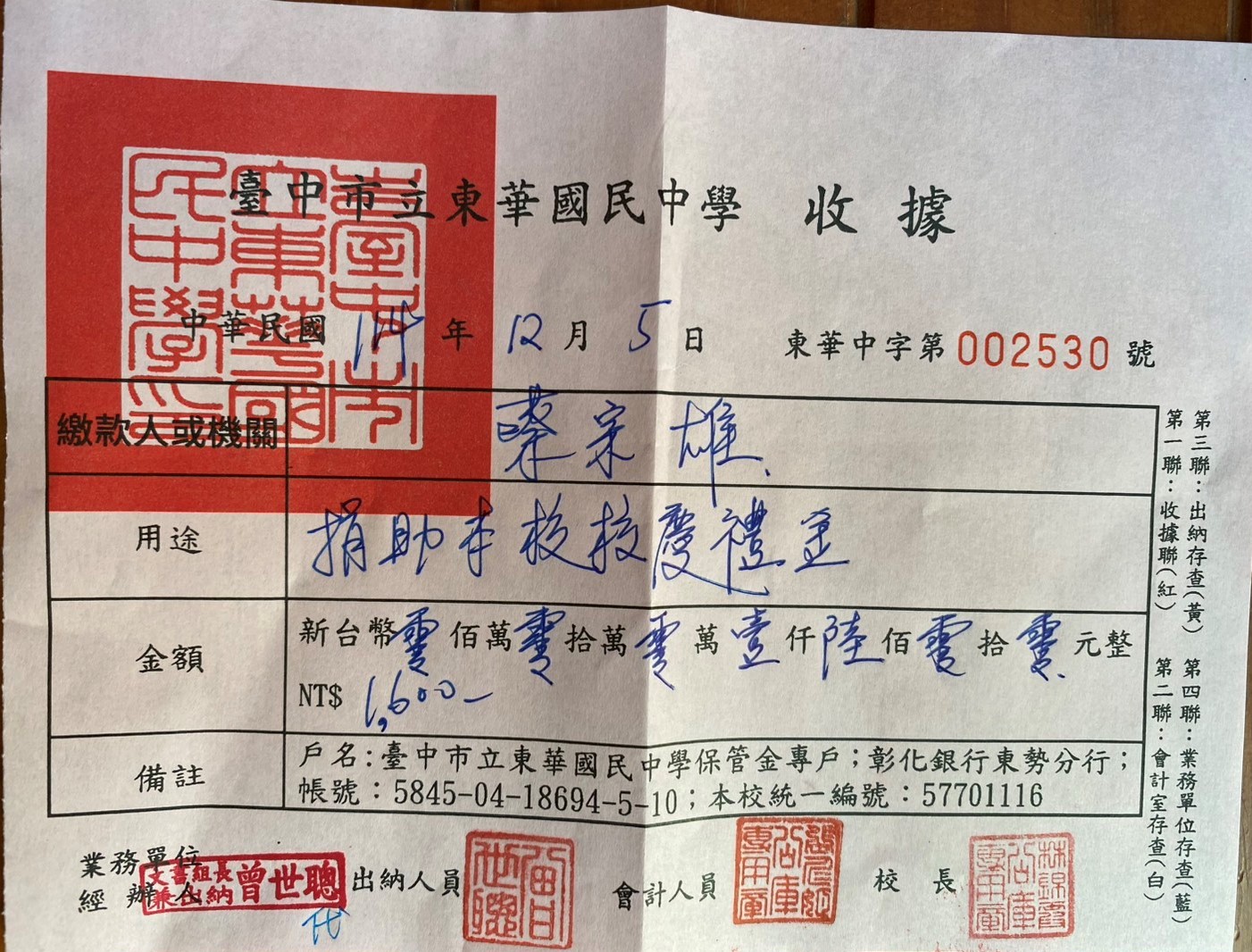 113年12月4日享魄頭精品咖啡負責人捐獻1500元給東華國中校慶禮金基金